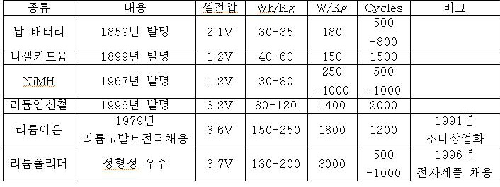중량 당 파워 측면에서 리튬 폴리머의 50% 수준이다. 하지만 충전수명에서 2배의 성능을 보여 주는 것으로 알려져 있다.